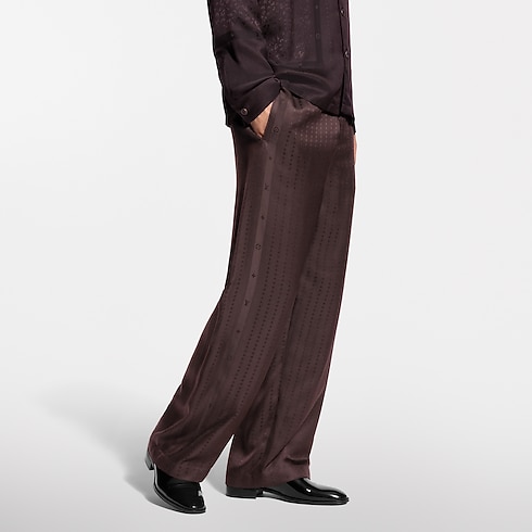 Richly embellished like a scarf, these fluid silk-blend pajama pants in rich brown tones are elevated with a jacquard Monogram Flower stripe motif creating a lustrous play of textures. The flowing, relaxed silhouette has a comfortable elasticated waist signed with a woven LV label. Pair with a matching shirt for a chic and cozy evening set.