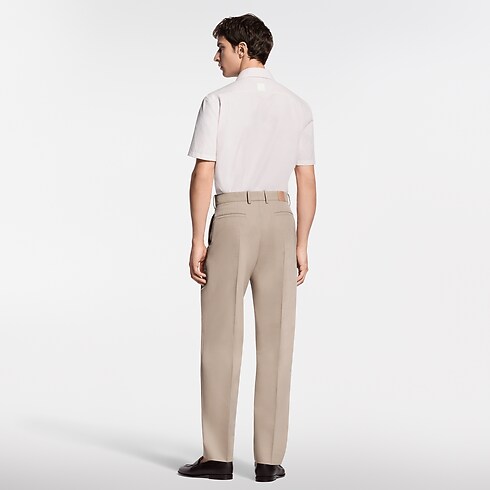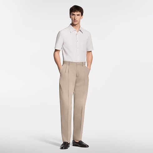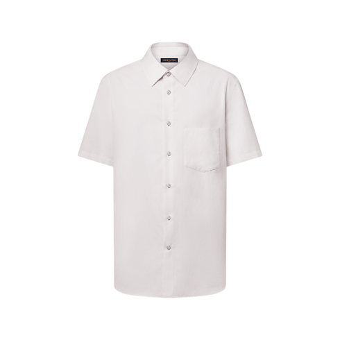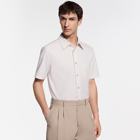 This ivory-toned short-sleeved shirt is a fresh option for warmer days. The fine, organic cotton is adorned with a jacquard LV Interlocked motif. Additional signature details include an LV button on the collar and woven signature labels on the button placket and the back. This piece can be paired with a suit in the same motif.