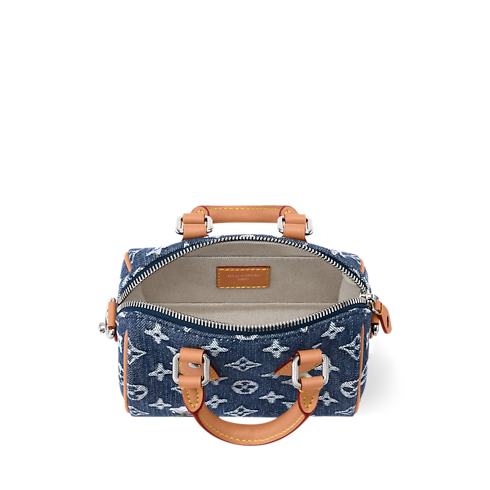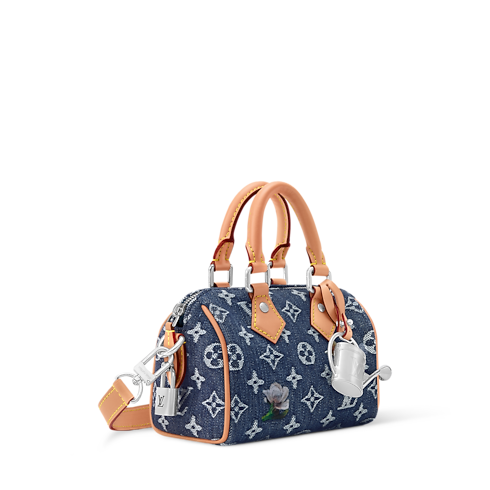 The smallest in the Speedy family, the compact Speedy 18 Bandoulière is made from Monogram Flowers Denim, accented with cowhide-leather trim and a metallic watering can charm. Its woven Monogram and subtle floral embroidery bring a fresh twist to classic lines. A detachable, adjustable strap allows both shoulder and cross-body carry.