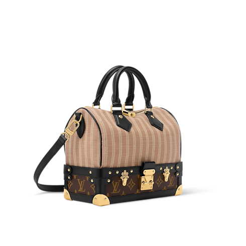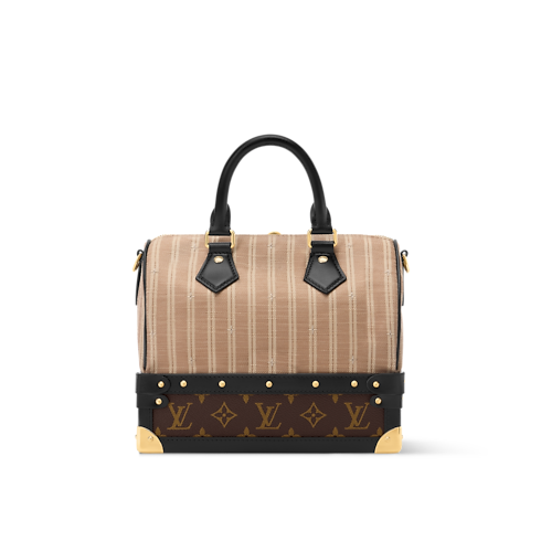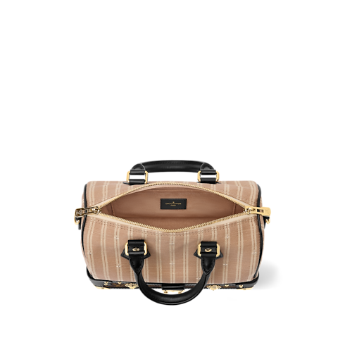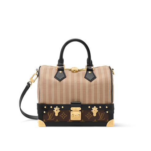 The Out Of The Trunk collection presents this unique edition of the Speedy Bandoulière 22, which pays tribute to archival Louis Vuitton luggage from bygone decades. It is made from signature Monogram canvas, which contrasts the striped Beige fabric and smooth cowhide trims. The vintage-inspired design is adorned with gold-toned LV signatures, including a padlock, trunk corners, and an S-lock closure.