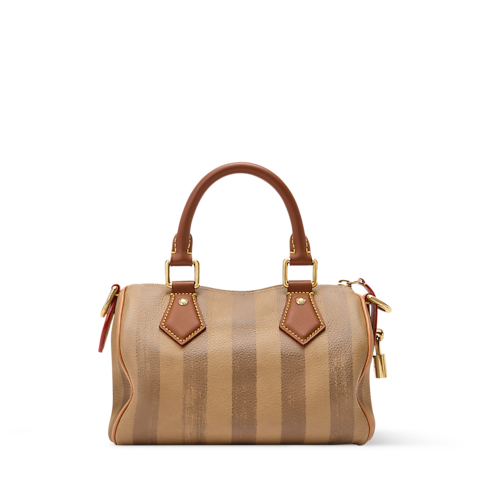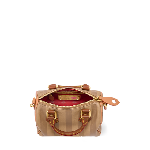With stripes printed on calfskin leather, the Speedy P9 Bandoulière 20 evokes one of the original patterns of Louis Vuitton trunks from the late 19th century. The washed-out print underscores the House’s artisanal expertise while reinforcing its historic reference. Inside, a red Monogram lining in printed goatskin adds a bold, luxurious touch.