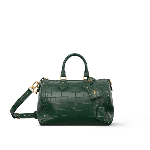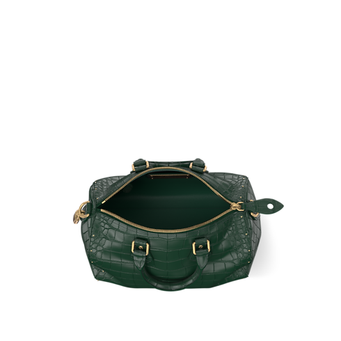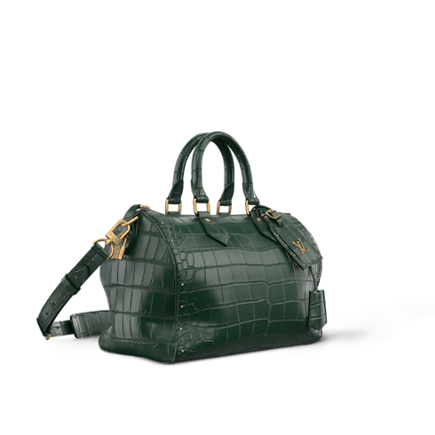 The Speedy P9 Bandoulière 30 is made from crocodilian leather with a finish so exquisitely soft and smooth that Pharrell Williams named it “Butter Crocodile.” Aged-gold-tone rivets accent its classic lines and the name tag, detailed with golden LV Initials. A lambskin lining completes the design, matching the exotic leather’s rich colorway.