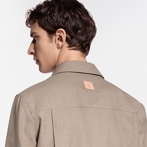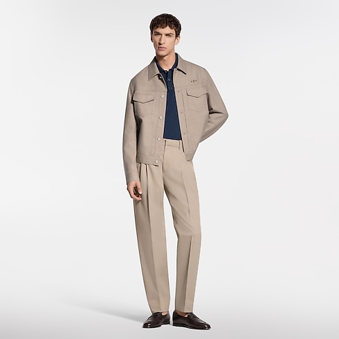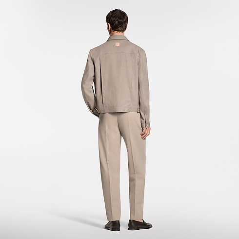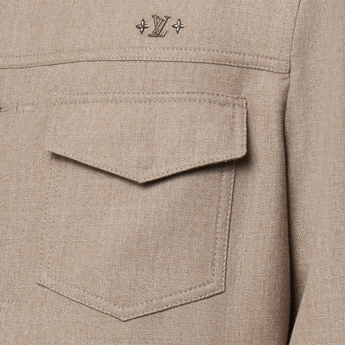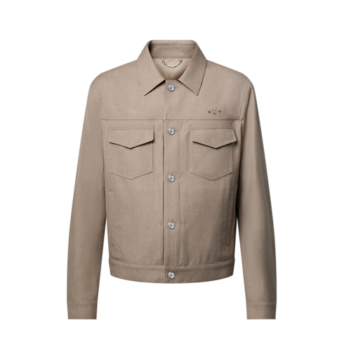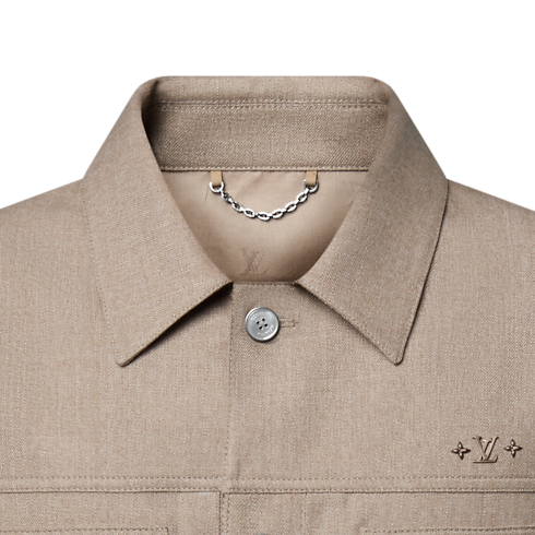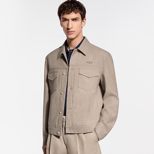 This tailored jacket offers a refined and modern take on the iconic trucker silhouette. Cut from timeless beige wool-silk twill, it is adorned with mother-of-pearl effect buttons and delicate signature ornaments on the chest, while a leather LV patch signs the back. Effortlessly elegant, this makes a perfect light outer layer for warmer days.