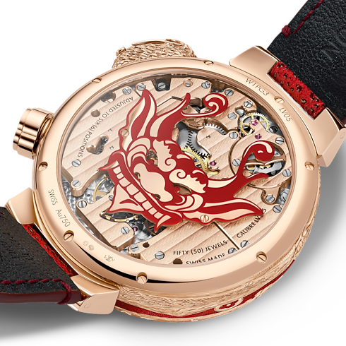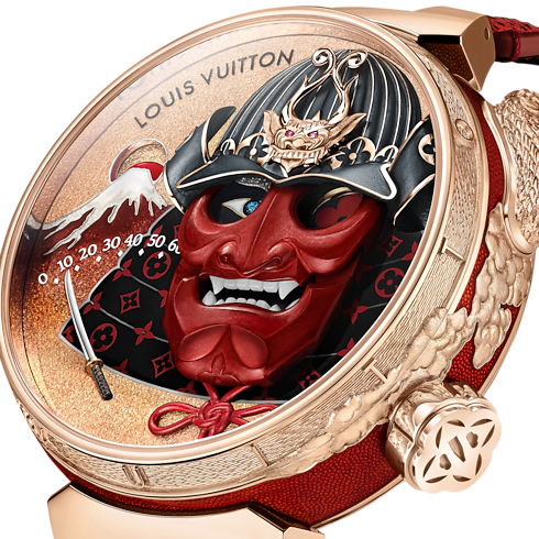 Taking its name from the code of conduct of the Japanese Samurai, the Tambour Bashido Automata is an homage to strength, discipline and artistic expression. The dial, which is embellished with a striking Samurai mask, features five different animations. These are powered by the award-winning LV 525 caliber and it reveals the time on demand. The intricacy of enamelling and engraving pushes the boundaries of the Métiers d'Art to celebrate Japanese culture, all around the case.