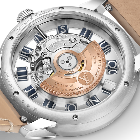 The limited edition Tambour Taiko Spin Time Air watch 42.5 mm revisits Spin Time, the iconic and first patented movement of the house, with a Spin Time Air movement. Powered by the fully redesigned Caliber LFT ST13.01, which is housed in the Tambour Taiko case in 18-carat white gold, this piece is distinguished by a unique dolphin grey color interpreted with a sunray dial.