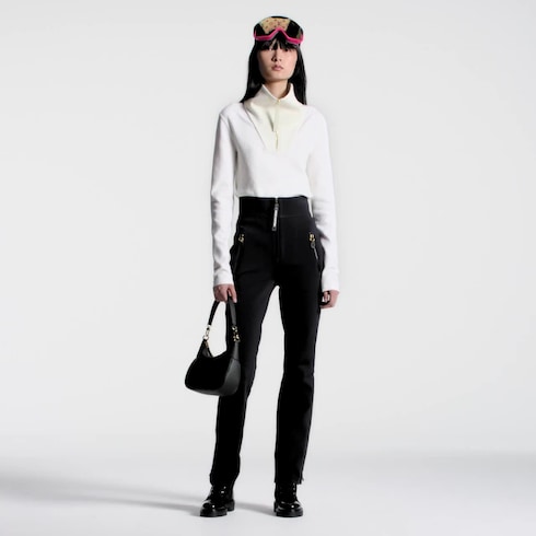 Sporty yet sophisticated: These ski pants are crafted from technical jersey in a sleek form-fitting cut with a sculpting high waist and subtly flared legs for an elongated silhouette. Complete with practical fastened pockets and ankle zippers for versatile styling. A graphic Louis Vuitton zipper pull signs the look.
