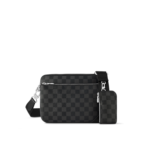 The modular Trio Messenger bag is made from Monogram Macassar coated canvas with hints of colored cowhide leather, specifically the piping that frames the bag. This hybrid bag is composed of a main compartment, a removable front zipped pocket, and a detachable small coin purse attached to the strap’s D-ring.