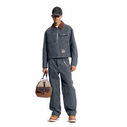 These dark gray organic cotton workwear pants are adorned with a jacquard Dandy Monogram motif from the Fall-Winter 2025 show. The textured, slightly debossed fabric plays out on a relaxed fit with jeans pockets and chaps while a pearl-effect button fastening adds a touch of dandy sophistication. A matching jacket makes a casual yet distinguished set.