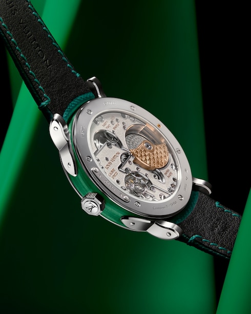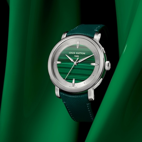 Louis Vuitton Escale Malachite is defined by its fine mineral banding, revealing deep green tones and variegated layers. Each 40mm timepiece is crafted with utmost care - from the precise selection of its ornamental stone to the delicate polishing that reveals its brilliance.