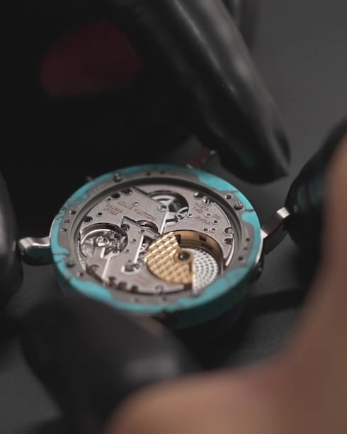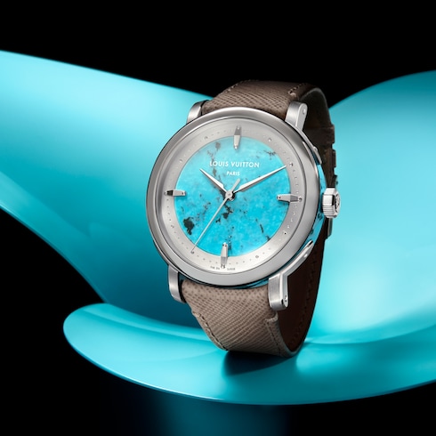 Louis Vuitton Escale Turquoise combines a dial and middle case in vivid blue stone, each cut from a single block veined with deep organic patterns that make every piece distinct. The 40mm watch reflects the technical mastery of La Fabrique des Boîtiers, Louis Vuitton's Geneva workshop devoted to the intricate craft of advanced case construction.
