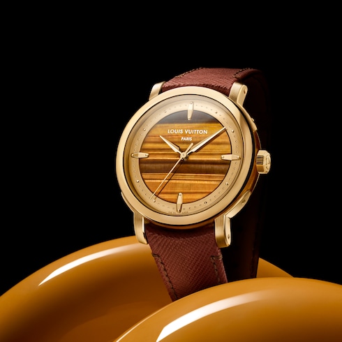 Marking the collection's first use of yellow gold, Louis Vuitton Escale Tiger's Eye debuts a new expression that lends greater depth to the stone. Carefully selected tiger's eye forms a continuous surface across the dial and middle case, its warm tonal striations calibrated to exude harmonious contrast and colour intensity.