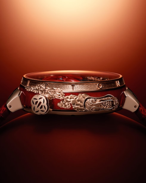 Continuing Louis Vuitton’s High Watchmaking journey, the exceptional Tambour Bushido Automata timepiece pays homage to Japanese art, culture, and history, referencing Bushido, the samurai’s code of conduct. Showcasing the exceptional savoir-faire of the House’s Métiers d’Art, the mask is brought to life with the push of a button – revealing the hours on the helmet while the katana sword indicates the minutes.