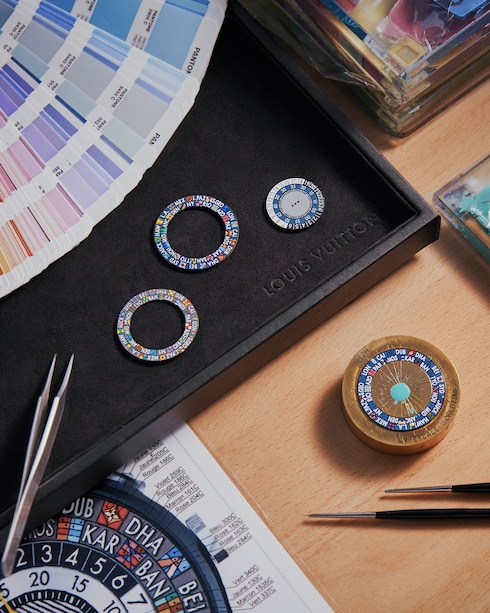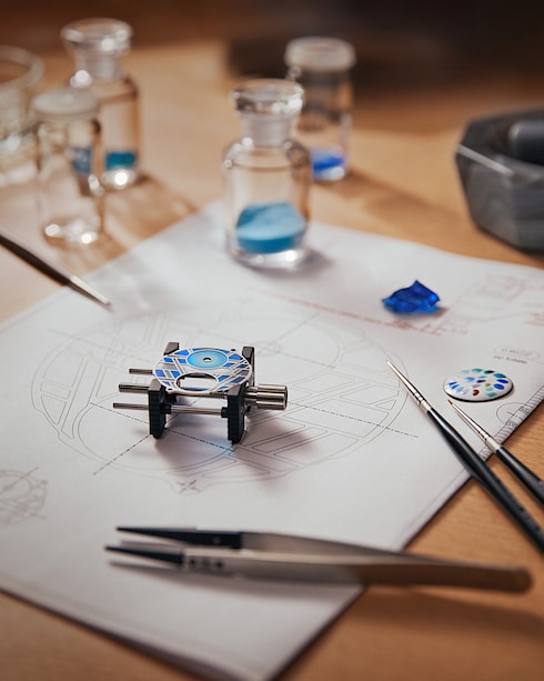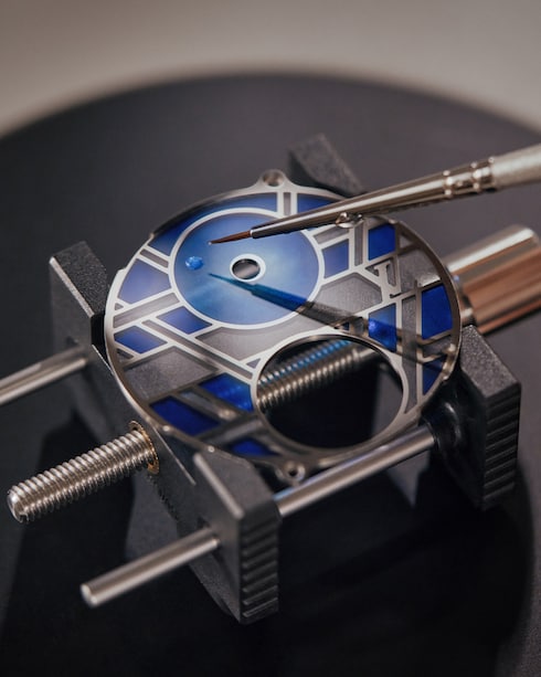 In an embodiment of the encounter between enamels and kiln heat to reveal the brilliance and intensity of colours, enameling is a demanding art that requires highly technical skills to be acquired over several years by the master enamelers of La Fabrique du Temps Louis Vuitton. These include plique-à-jour, with its play of transparency and contrasts, highlighted by a gold cloisonné structure, and paillonné, which magnifies enamel layers with fine flecks of gold leaf.