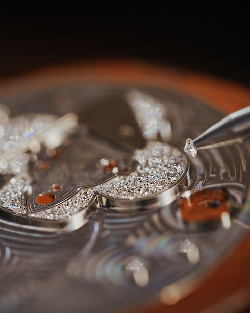 Embellishing bezels, cases, and dials with radiant brilliance, gem-setting adds a touch of preciousness to the Manufacture's creations. The metal is first finely worked by the master jeweler to house the stones, which are then set with immaculate care and artistry by the master gem-setter, using refined methods such as closed, claw, and snow settings to evoke a poetic finish.