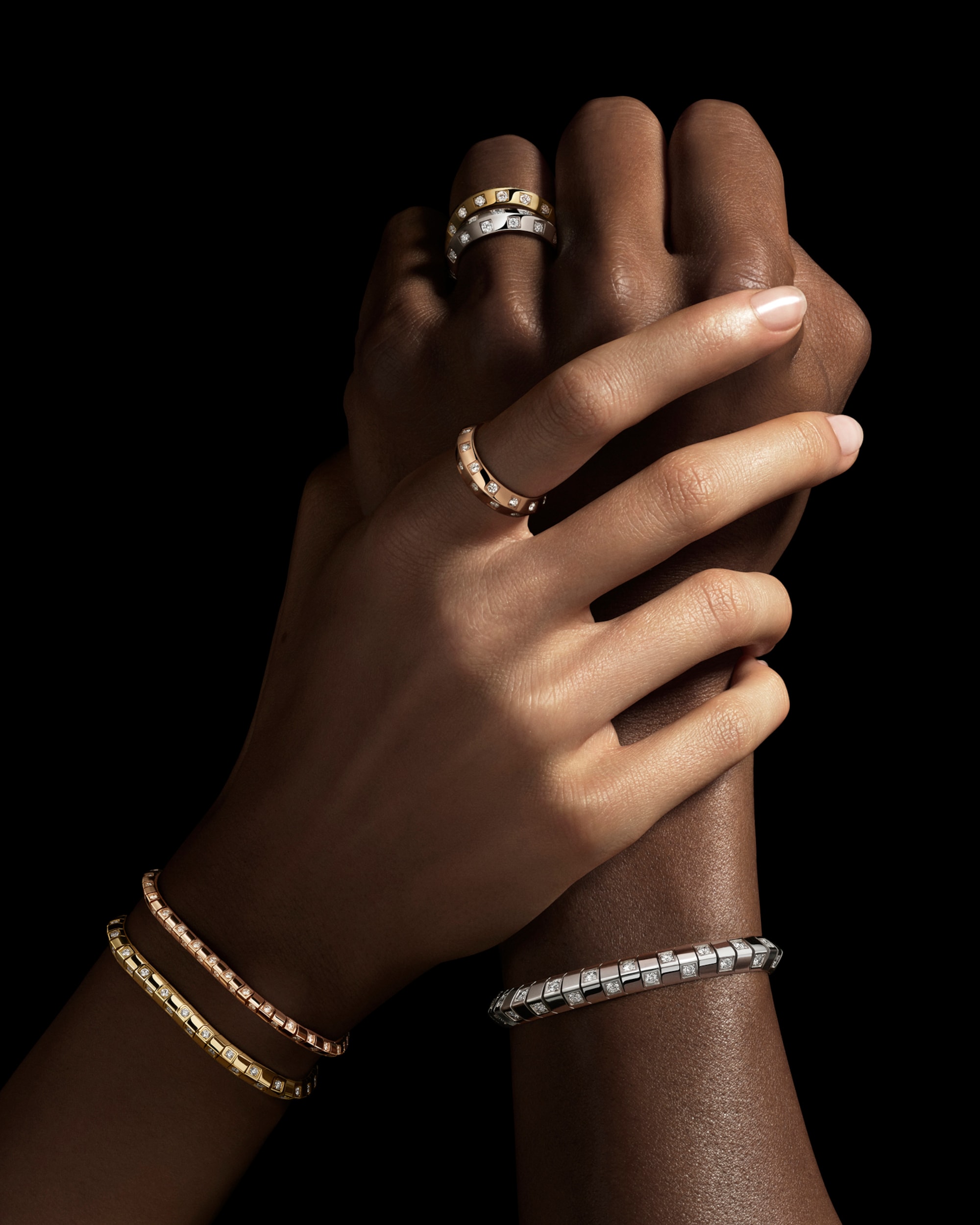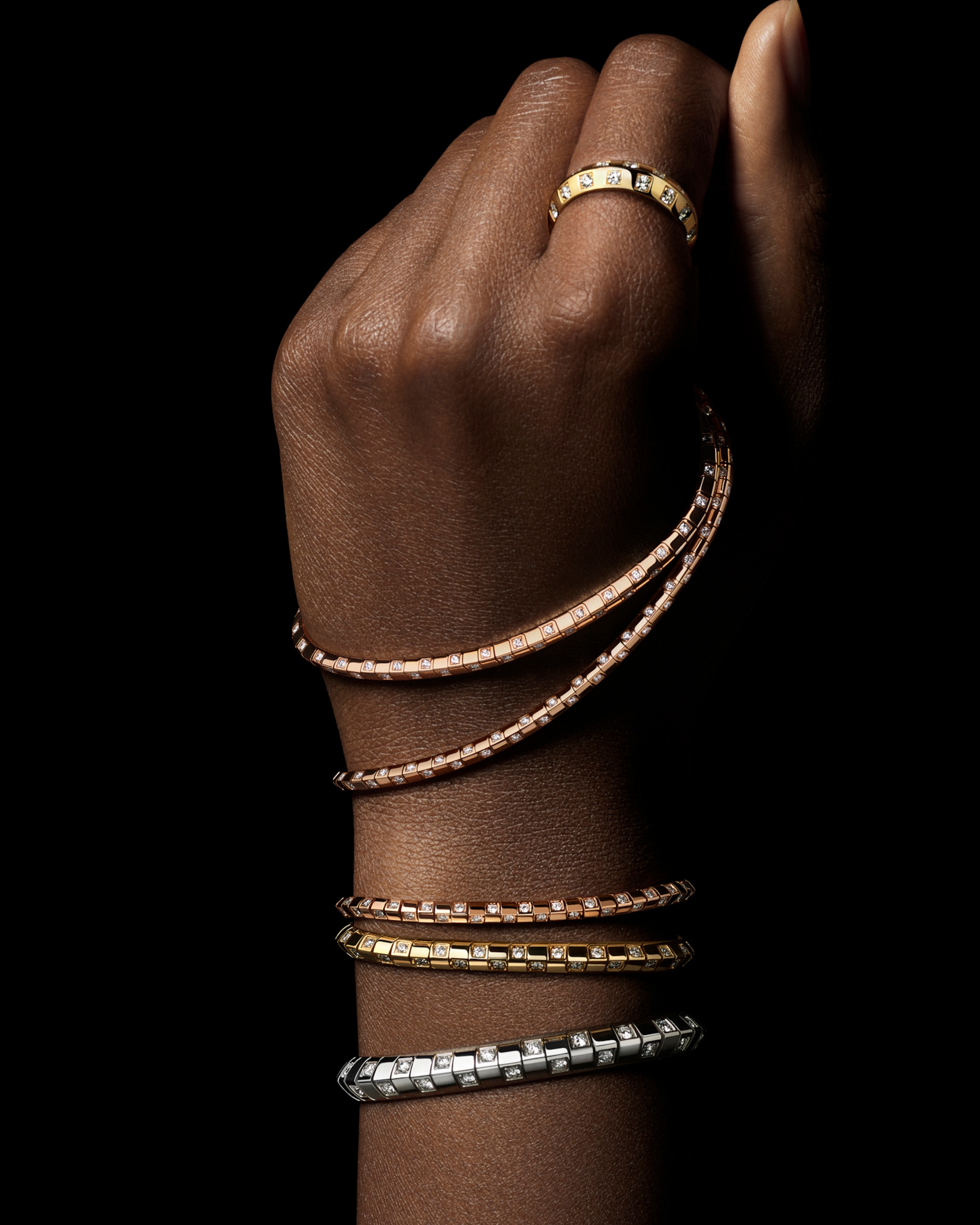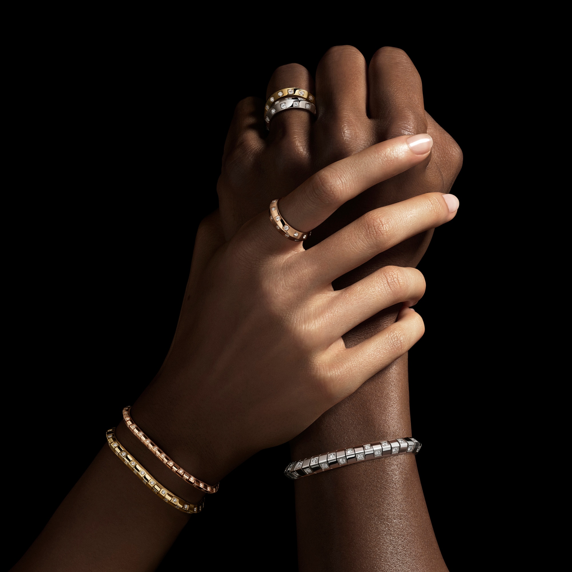 Exuding a pure dynamism, the unisex design is unveiled in three widths in white, yellow, or rose gold for limitless stacking, layering, and styling combinations.