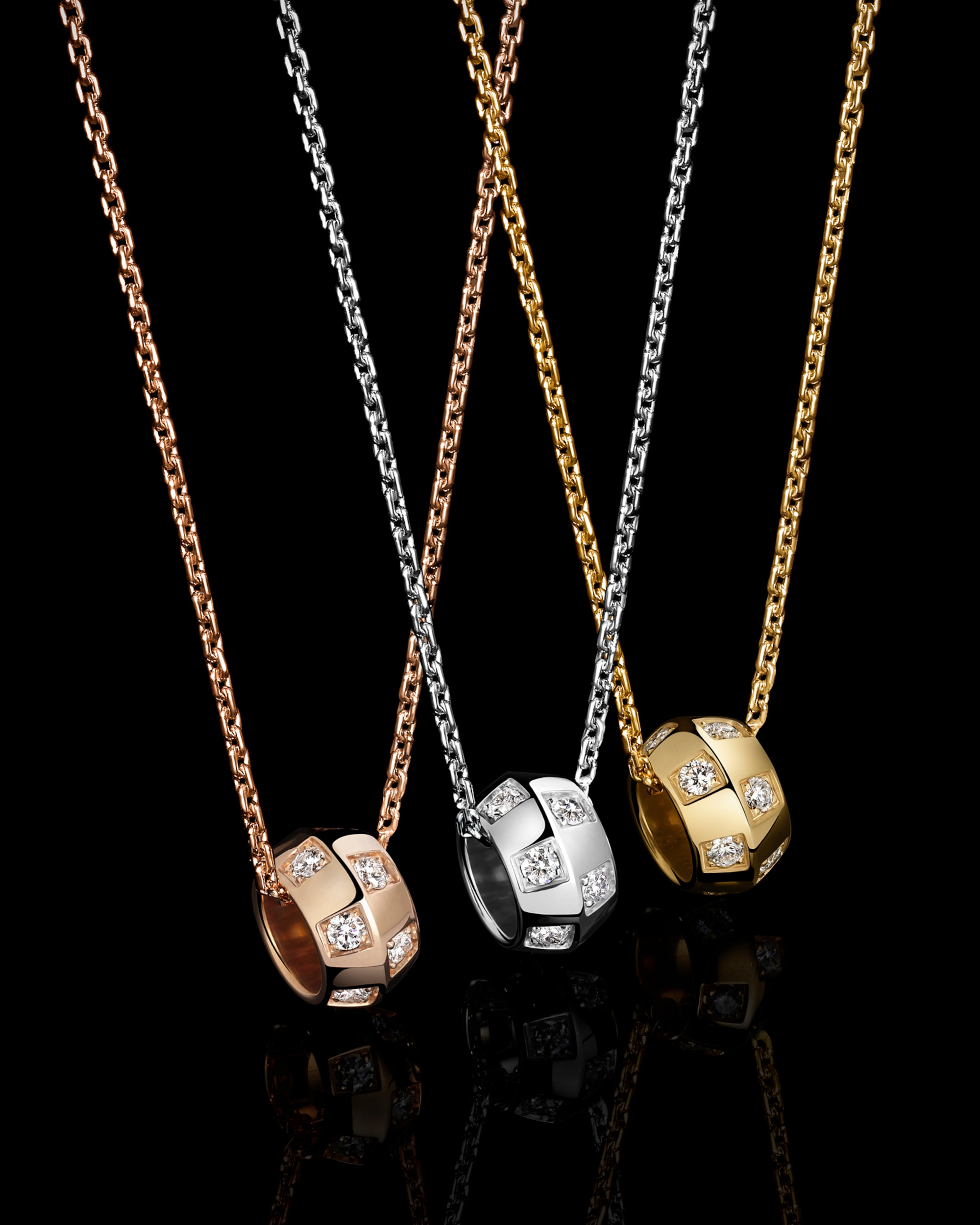 Geometric settings in earrings and pendants unfurl with a hypnotic continuity across white, yellow, or rose gold — emblazoned by the House's cherished iconography.